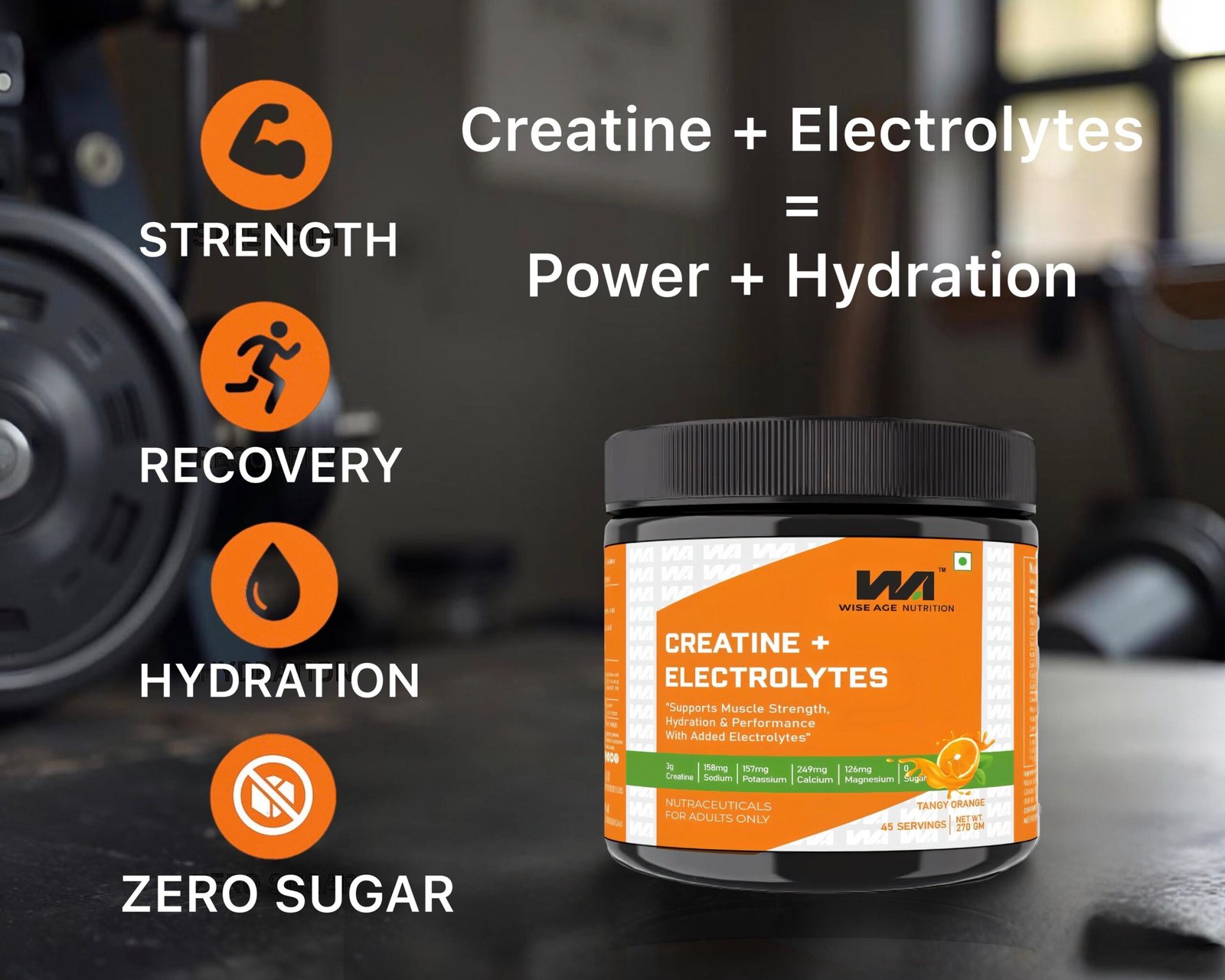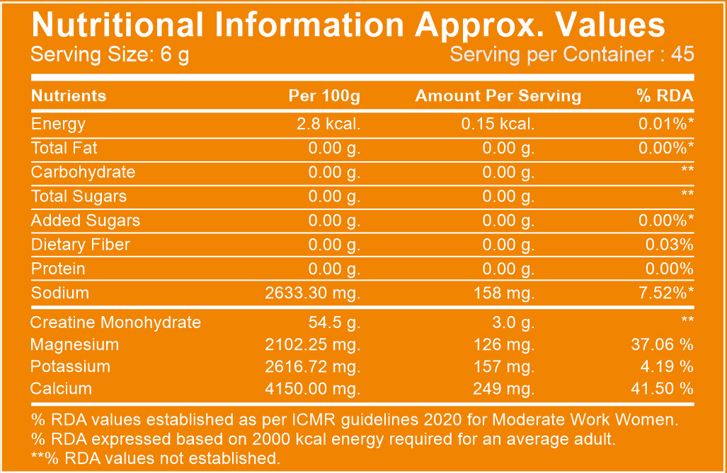 Creatine Monohydrate, Acidity Regulators, (INS 330 & INS 296), Nature Identical Flavor (Orange), Calcium Carbonate, Salt, Potassium Chloride, Magnesium Hydroxide, Sweetener (INS955), Anti-Caking Agent (INS 551), Natural Colors (Curcumin Extract).